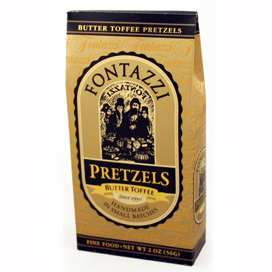 $2.35 | Tell a friend | Print Code: 310GOLD | Brands : Fontazzi Pretzels Shipping Weight 4.00 OZ Case Pack 24.0000 Description Butter Toffee Pretzels Dimensions 7"h x 3.5"w x 1.5"d Size 2 oz Color Gold Maximum Shelf Life 3 - 6 Months Made in: California, USA Qty: