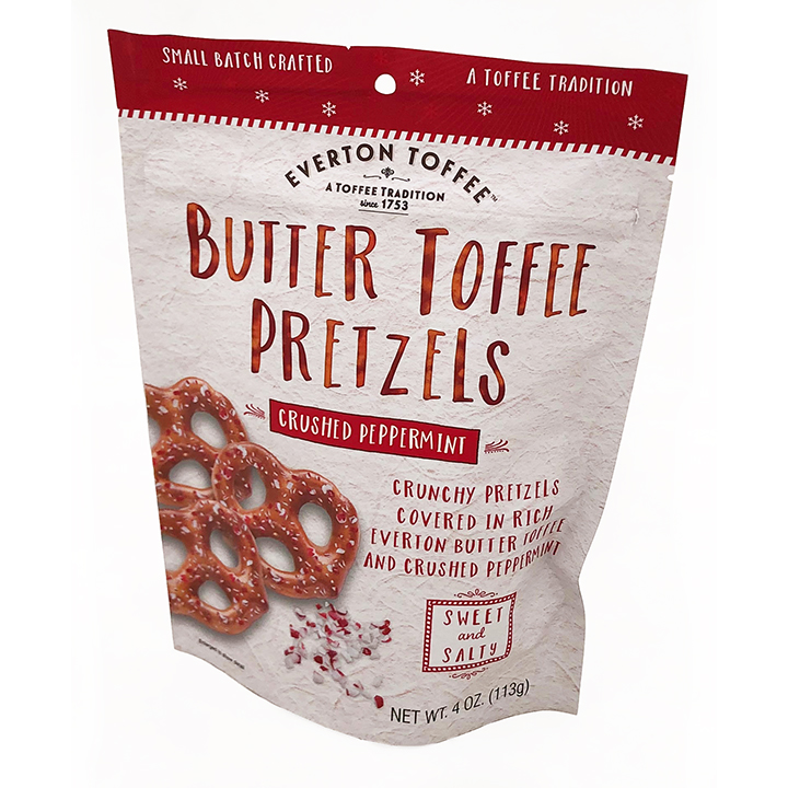 $3.55 | Tell a friend | Print Code: E318 | Brands : Everton Toffee Co. Bags Shipping Weight 6.00 OZ Case Pack 12.0000 Description Peppermint Butter Toffee Pretzels Dimensions 6.6"w x 8.8"h x 1.4"d Size 4 oz Maximum Shelf Life 12 Months Made in: Made in California Qty: